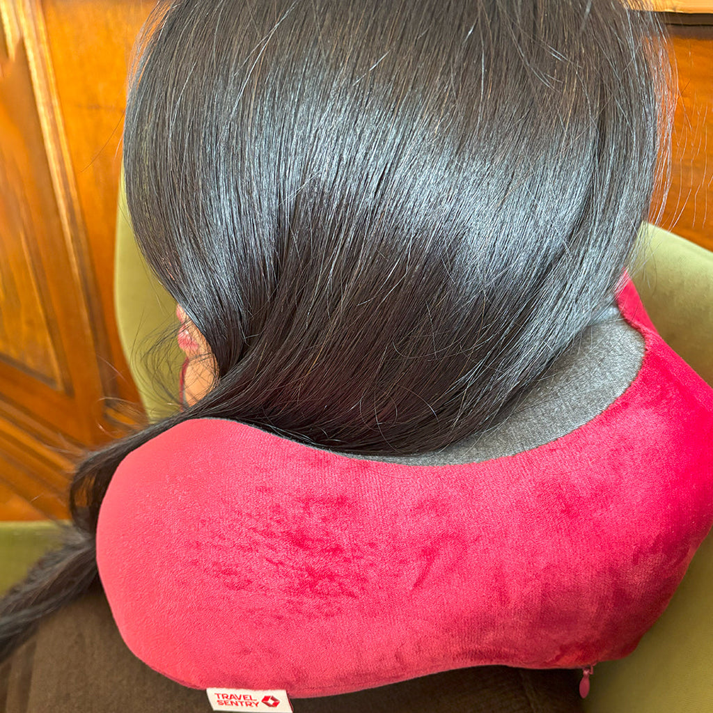 TRAVEL SENTRY Perfect Rest Travel Pillow— Soft velvet, contoured for perfect cervical support, and adjustable for a secure, comfy fit. Travel smarter, travel in comfort.